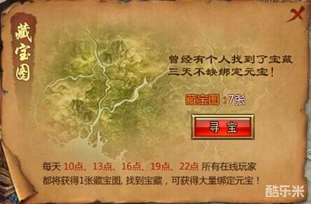 【玩法介绍】1.在每日10点、13点、16点、19点、22点所有在线的玩家都能获得一张藏宝图2.每次寻宝,都需消耗一张藏宝图3.点击寻宝,即可在界面左侧显示该宝藏所在的角落图片,并告知玩家该地点所在地图4.玩家需根据宝藏所在地图,并在该地图上根据宝藏所在角落图片去寻找宝藏所在地例如: