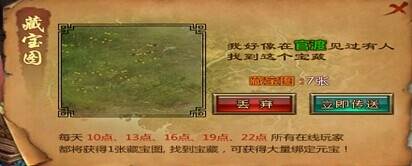 5.当成功寻找到宝藏时,点击该宝藏,即可获得该宝藏内所有道具6.当点击寻宝后,玩家可点击“丢弃”,即可放弃本次寻宝7.当点击寻宝后,玩家可点击“立即传送”,即可免费传送至该宝藏所在地图8.宝藏所在地每次都是随机出现,宝藏每次奖励道具数量及元宝数量亦不同