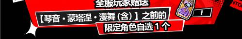 1、第一弹:全服玩家赠送【琴音·蒙塔涅·漫舞(含)】之前的限定角色自选1个。