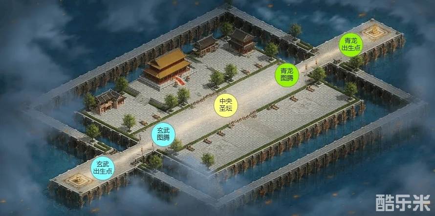 1、进入战场后,双方家族会随机分配到左下(玄武方)或者右上(青龙方);双方需要围绕地图中三个关键据点——青龙图腾、玄武图腾以及圣坛进行争夺战斗