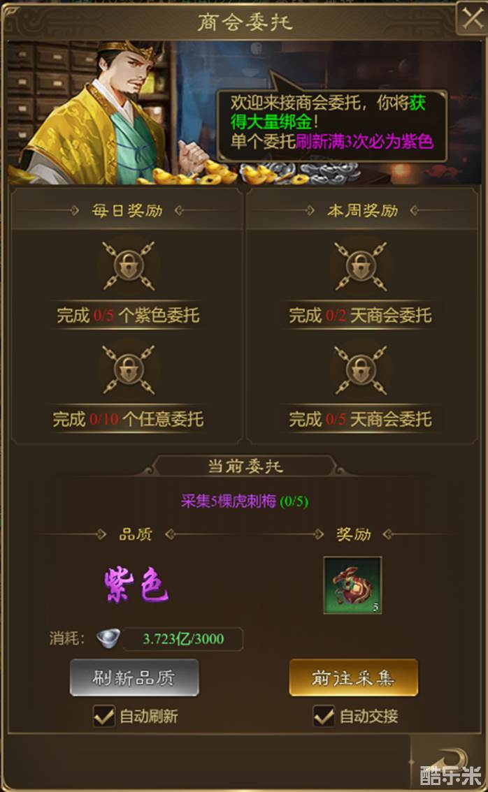 完成商会委托可以获取多种道具,多角度提高自身战力!打开“日常“界面,在每日任务中找到”完成1轮商会委托“,下面和酷乐米小编一起来看看吧