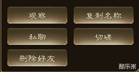【好友管理】 在“好友”界面点击好友所在栏,就能弹出可操作选项框,可以选择与好友私聊,观察好友,切磋,复制名称或是删除好友。