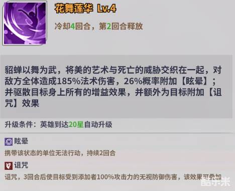 貂蝉作为法师输出位,有着能够为敌方群体附加暗属性英雄独有的【诅咒】效果。