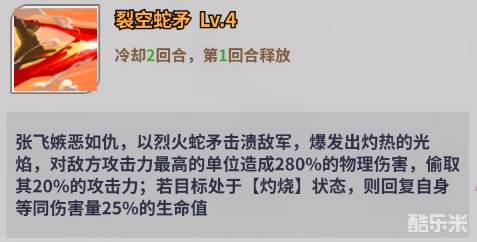 能够造成伤害同时附加【灼烧】状态,此外,张飞还可以对敌方攻击力最高的目标造成伤害,并偷取攻击,提升自身属性同时削减对方属性。