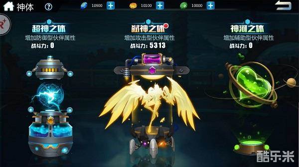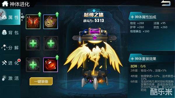 神体系统作为“天使VS恶魔”新资料片中新增的装备玩法,由六个部件组成:羽翼,智脑,能源石,生物引擎,暗能量仪,虚空控制器。神体分为三个类型:超神之体、弑神之体、神河之体,对应防御、攻击、辅助三类英雄。神体不能装备相同部件的装备,而六个部件分别在20、40、60级当中各解锁两件。