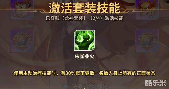 两件套名称:朱雀业火使用主动治疗技能时,有30%概率驱散一名敌人身上所有的正面状态