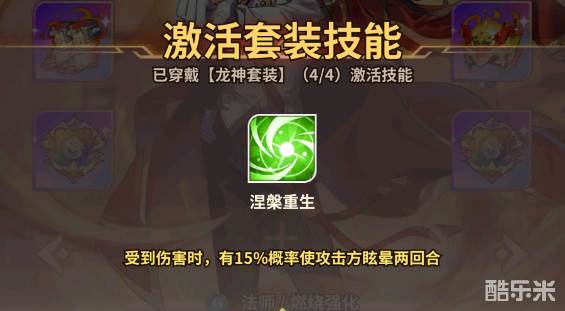 四件套技能:涅槃重生受到伤害时,有15%概率使攻击方眩晕两回合