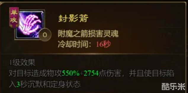 封影箭:对单体造成高额物理伤害,并且使目标陷入沉默和定身。