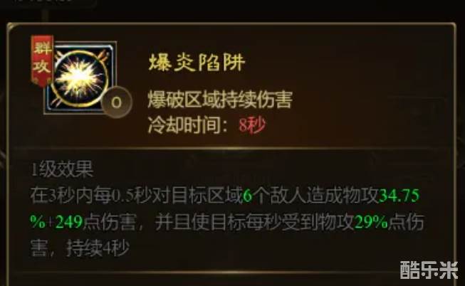 爆炎陷阱:3秒内对范围内的敌人造成多段伤害,并且会附带额外的持续伤害。