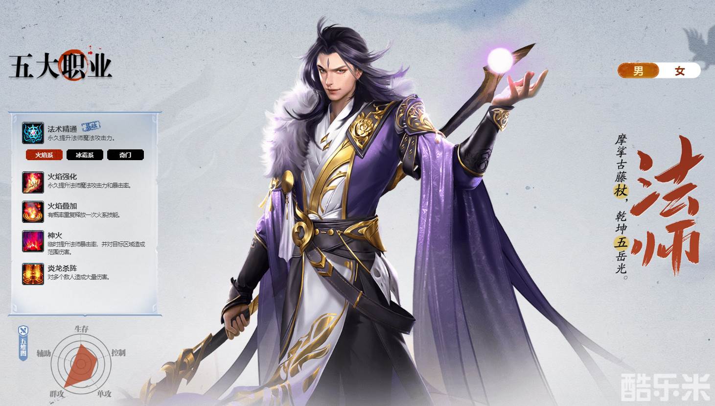 师是远程法系输出职业,拥有火焰系和冰霜系两个分支,今天介绍的火焰系有着高范围群攻伤害的特点。作为游戏中当前版本最炙手可热的法系输出担当,火焰法师在大部分群攻的玩法中,都有着非常良好的表现。尤其在面对多个敌人时能够打出高额的暴击和范围伤害,并且释放技能时有概率免冷却再度释放,如果你的队伍欠缺持续爆发伤害,他一定是你的不二选择!下面和酷乐米小编一起来看看吧