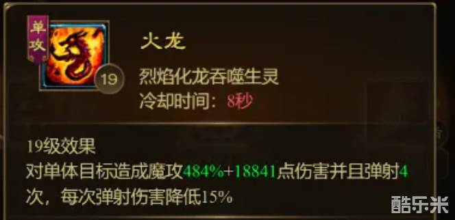 火龙:对单体目标造成高额魔攻伤害,并且会进行弹射对周围敌人也造成伤害。