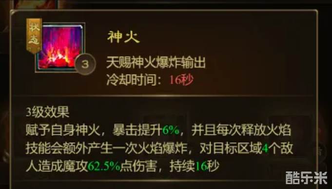 神火:被动提升暴击,并且每次释放火焰技能会额外造成范围爆炸伤害。