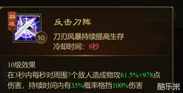 反击刀阵:在3秒内对周围敌人造成伤害,并且受到攻击有概率格挡伤害。