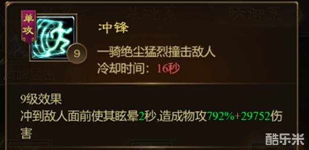 冲锋:冲到敌人面前,并且造成眩晕,同时造成物理伤害。
