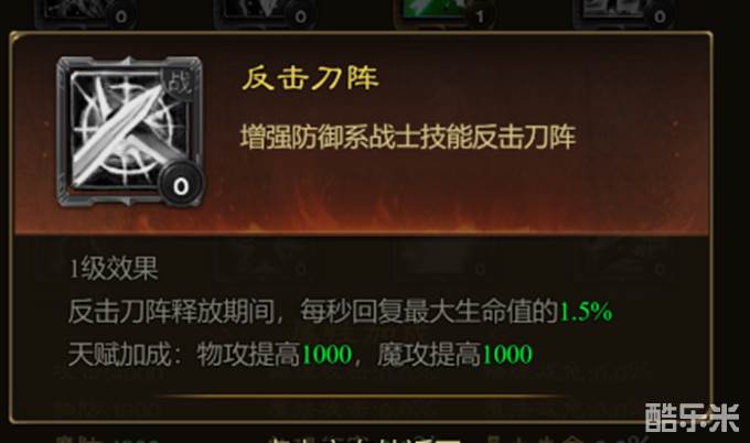 反击刀阵期间,可以为防御战士带来每秒回复最大生命值的效果,同时提高攻击属性。