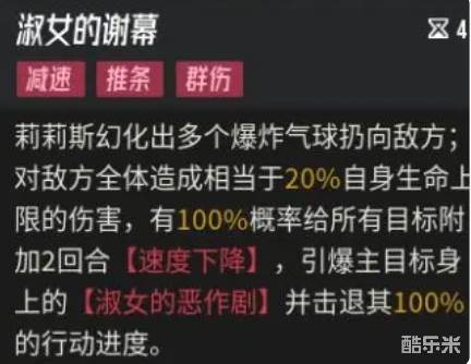 同时有100%的概率给所有目标附加2回合的速度下降状态,此外引爆主目标身上的淑女的恶作剧并击退其100%的行动进度,这个技能给游戏带来了很多不同的标签,如被动、增益、减益、推条、拉条和群伤等,首先这个技能可以降低敌人的攻击频率和出手速度,通过减少敌人的速度,玩家可以有效地控制战斗的节奏,使自己的角色能够在敌人之前出手,这对于一些需要先手优势的战斗策略来说非常重要。