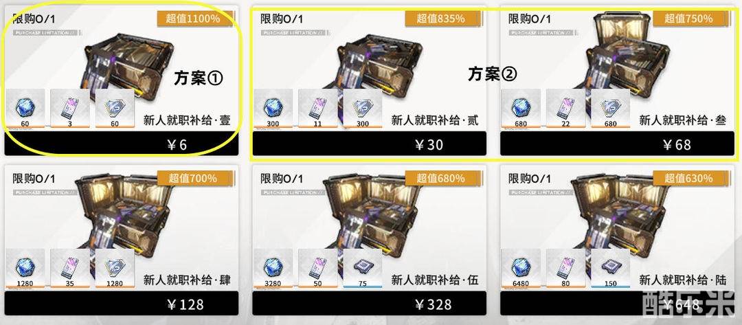 6元党选方案①,新手礼包想拿满的选方案②,选择328和648性价比低一些,但是可以在前期就换一个定制模组或者授勋一次,前中期开荒会舒服很多。方案③可以68+月卡,长期玩的话相较方案②性价比会更高一些。