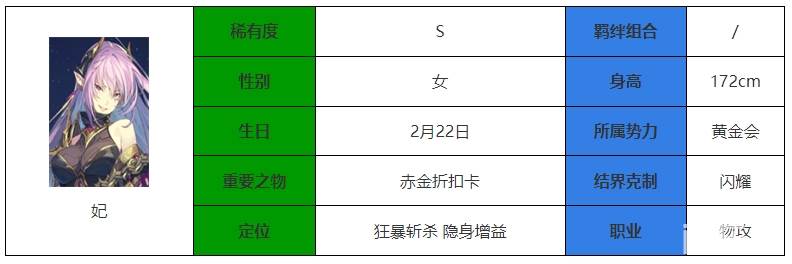 【唯一技能】妃在场时,提高己方全体20%暴击率,并且每当己方单位触发暴击时,该次伤害值的1%会转化为妃的攻击力,累计加成不会超过妃攻击的50%。