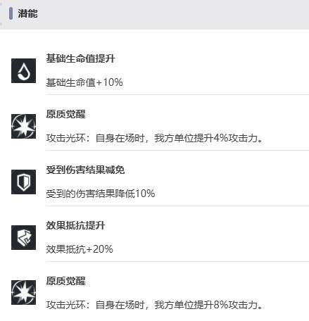 攻击上升的效果使队友的攻击力提升40%,让他们在接下来的战斗中能够造成更高的伤害,而防御上升效果则使队友的防御力提升60%,有效减少来自敌人的伤害,这两个增益效果的结合就代表了杜兰铎最强的效果,随着杜兰铎等级的提升,在等级2时她的生命值将永久增加3%,等级3时生命值再次增加3%,当达到等级4时生命值第三次增加3%,最终在等级5时,她的飞天轮舞技能冷却时间将减少1回合,此时她的生存效果才是最强的时候。