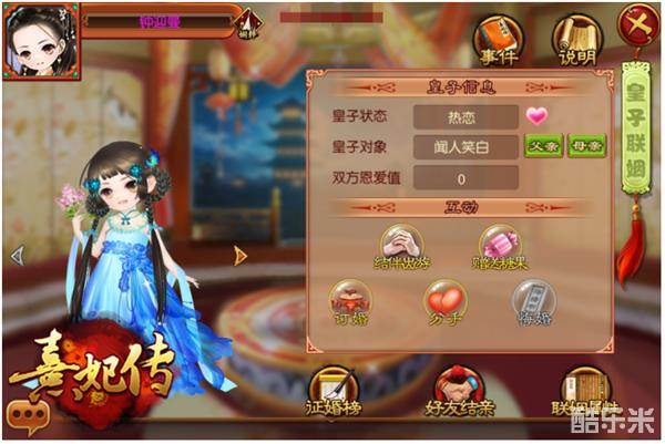 在即将开启的皇子联姻系统中,允许小主们为家中的皇子发布征婚说明。当然你也可以相应其他小主的征婚,与宫廷好友结为亲家。皇子们找到对象后便可与自己的青梅竹马培养感情。天气不错就相约结伴出游玩耍,再互赠几颗糖果,孩子之间的感情就是那么清纯无暇。等到时机成熟、感情稳固,小主们便可做主为他们订下婚约。如若觉得双方不合适,也可分手或悔婚。小小皇子的婚姻大事成败与否,就看小主们的啦。