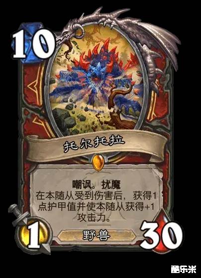 战士的荒野之神,嘲讽。扰魔。在本随从受到伤害后,获得+1护甲值并使本随从获得+1攻击力。