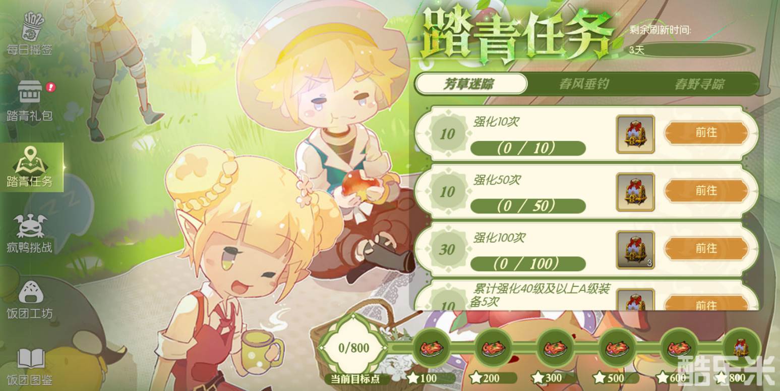 接下来的“踏青任务”是活动的核心之一。每天都有全新的任务等待着大家,任务内容轻松简单,只要按照指示去完成,就能轻松获得饭团制作材料和其他丰富奖励。这种任务不仅能让你在轻松愉快中获得奖励,还能在不知不觉中提高游戏的活跃度。