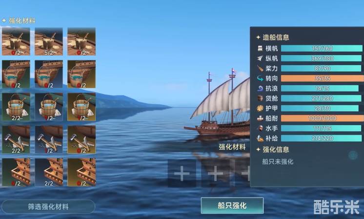这时候玩家就可以根据自己的需求,还有这个船只的弱点进行提升,比如可以着重提升横帆,纵帆,还有船只的抗浪,提升完这几个之后,船只的稳定性会更好一些,如果想要让船只在抵抗攻击方面能力更强的话,那就可以强化护甲和船耐,另外还可以选择提升浆力,让船只的移动速度变得更快一些。