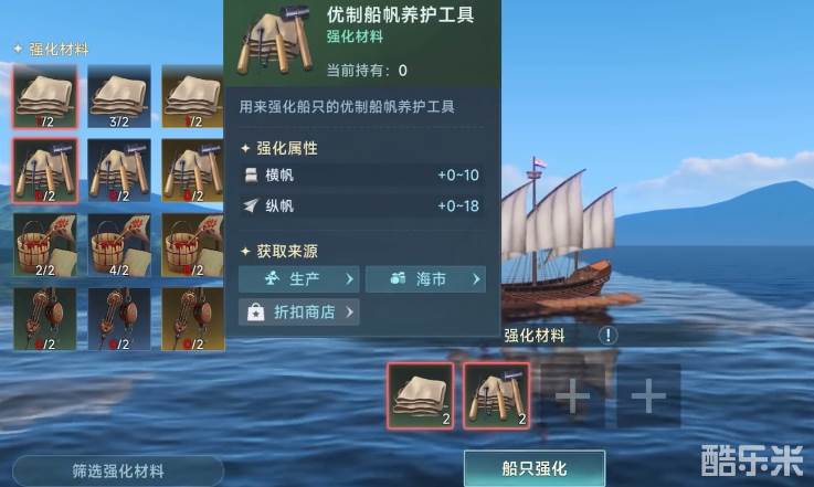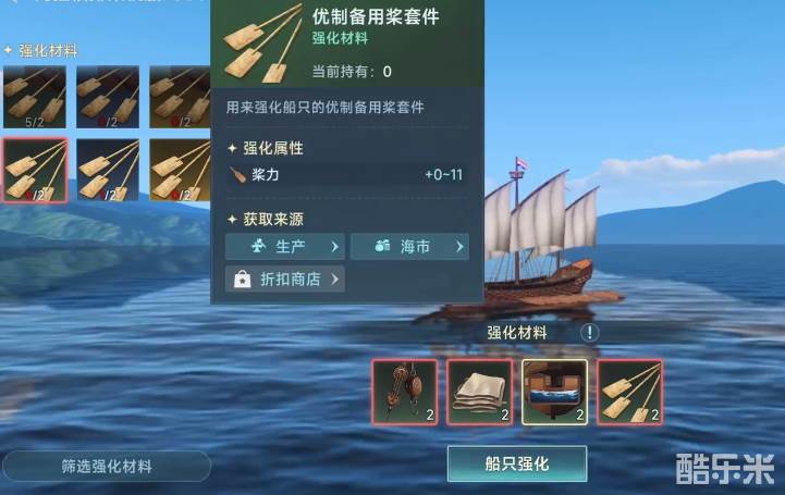 比如可以选择优质船帆养护工具,这是可以直接提升横帆和纵帆的一种材料,如果没有拥有这种材料,就可以直接在游戏里生产或者去折扣商店购买,也可以选择去海市购买,优质帆布专用涂料也是强化横帆和纵帆的材料,想要提升船桨的能力,那就可以用优质备用船桨套件进行强化,强化完成之后,这个船只的各项能力都会变得更强,同时整个船只的等级也会有所提升。