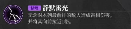 无念对本列最前排的敌人及其周围一圈8格上的敌人造成雷相伤害。并给目标添加【夺魂】,持续4回合。