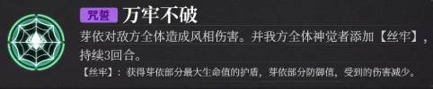 芽依对敌方全体造成风相伤害。并我方全体神觉者添加【丝牢】,持续3回合。