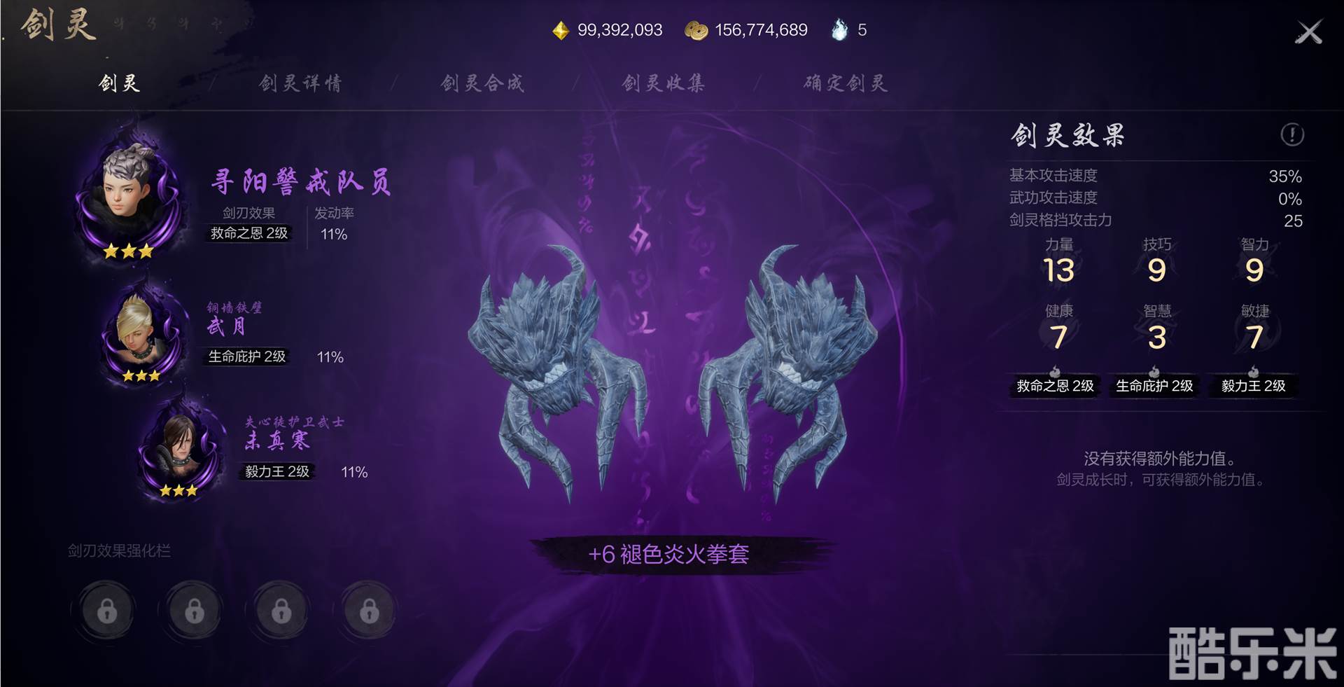 能和武月搭配使用的剑灵有寻阳境界队员以及未真寒等,寻阳警戒队员可以作为拳套的主教零,武月和未真寒则为副剑灵,他们的组合在一起产生的剑刃效果为救命之恩配合生命庇护以及毅力往。