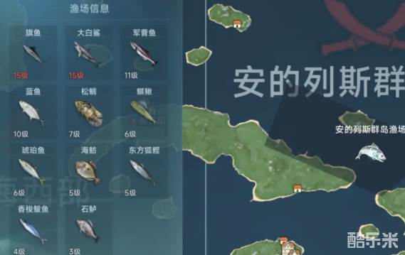 首先在游戏里的就是安德列斯群岛渔场,在这个渔场里能获得很多等级较高的鱼类,比如大白鲨和旗鱼、琥珀鱼,渔场的位置就在皇家港北侧,另外在这里还有11级的军曹鱼和10级的蓝鱼,最低级是3级的石鲈,和4级的香梭鲅鱼,如果想捕获对应的鱼类,那就可以来安德列斯群岛渔场,在百慕大渔场里,鱼类的等级相对来说比较低一些,等级最高的就是11级的军曹鱼和10级的蓝鱼,但是在这里有8级的条纹鲈鱼,这是游戏里的一种特殊鱼类,等级比较低的有1级的沙丁鱼和5级的马鲛鱼。