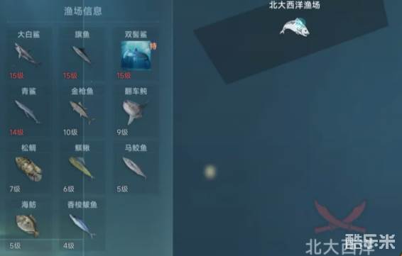 在北大西洋渔场里,鱼类的等级大部分都比较高,并且也有一种特殊鱼类,首先就是等级最高的15级大白鲨,还有15级的旗鱼,另外还有15级的双髻鱼,这是一种特殊鱼类,另外还有14级的青鲨和10级的金枪鱼,等级比较低的有4级的香梭霸鱼和5级的海鲂鱼,另外一个渔场就是北海渔场,这个渔场位于不列颠岛东岸,渔场里有10级的大虾,6级的绿旗鱼,另外就是1级的沙丁鱼和飞鱼,还有2级的秋刀鱼这些低等级鱼类。