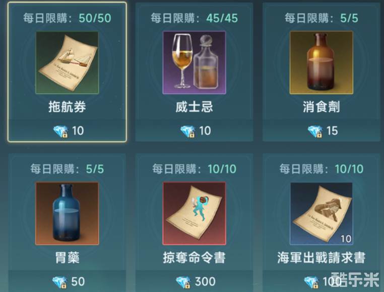 另外在游戏里还有作战指令书,这是提升战斗效率的道具,有了指令书之后还能缩短海战的时间,玩家能节约更多的时间在探索和贸易上,要想让战斗更加游刃有余的话,可以选择购买这些指令书,有海战指令书和陆战指令书这两种,可以根据自己的需求在游戏里购买,另外在游戏里还需要购买消食剂和胃药,消食剂可以帮助玩家提升自己的行动次数,为药能维持较高的行动力,胃药50钻石一个,每天限购5个,消食剂15钻石一个,每天也是限购5个。