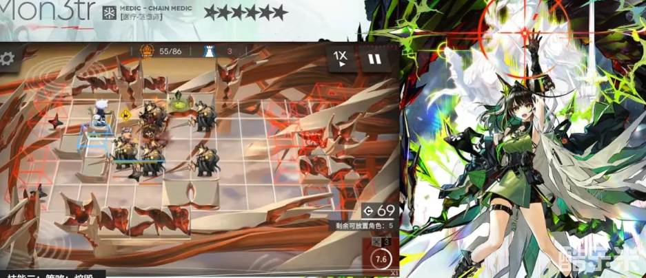 三技能是Mon3tr最强大的技能之一,攻击范围扩展到周围9格,攻击力提升330%,攻击间隔缩短至1.3秒,并且能阻挡3个敌人。