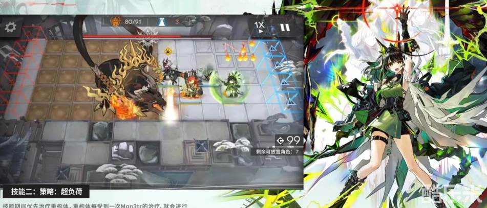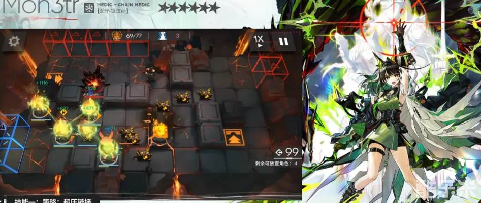 技能开启后,Mon3tr将优先治疗重构体,且每次治疗都会触发重构体的跳跃治疗。攻击速度提升62%(M3时可提升至56%),攻击次数高达16次,持续时间30秒,技能回转时间15秒。