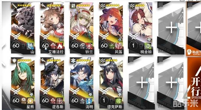 艾雅法拉、铃兰、风笛、桃金娘、星熊、逻各斯、流明、德克萨斯,本关携带角色相对较多,这样回费率会高一些。