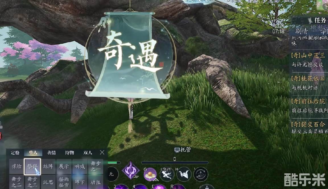 桃林内的所有奇遇内容,实际上都是祭拜内容,玩家需要通过特殊动作的方式,前往到遗迹处,完成动作后,就能够触发奇遇了。