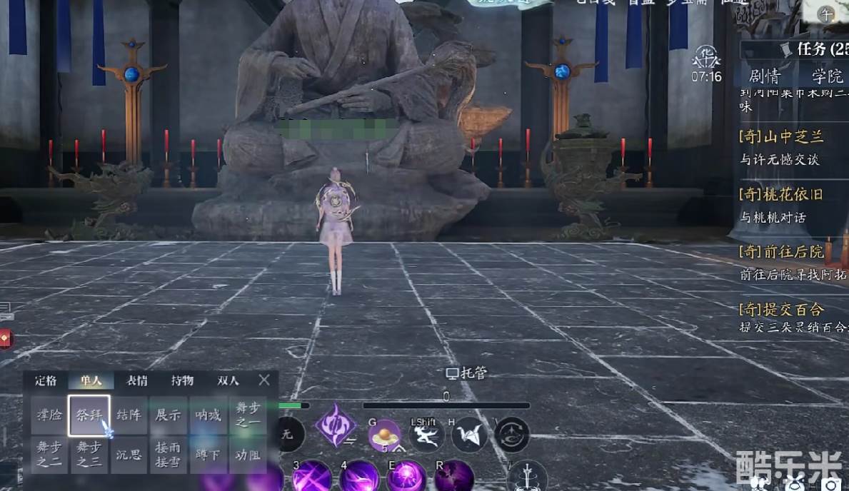 玩家将时间切换到夜间,随后前往到桃林中心位置,找到一尊大佛,该位置可以触发奇遇夜光杯任务,可月亮树下面的佛像在闪烁光芒时候,玩家打开表情功能,通过祭拜的功能,来触发奇遇的前置条件,触发成功之后,玩家进一步的展开祭拜,就能够加快任务的进度了。