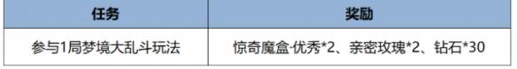 活动期间,完成1局梦境大乱斗可获得惊奇魔盒、亲密玫瑰等奖励。