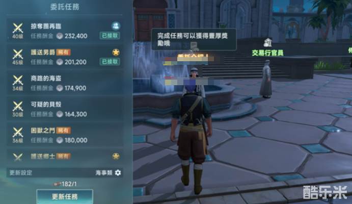 想要在游戏里体验海事玩法,那就需要先去港口,在港口这里会有委托人,会委托玩家大量的海战任务,每一个任务都有不同的酬金,并且根据任务难度的不同,都会划分出相应的等级,完成任务之后,玩家还有机会获得一些物品的奖励,可以根据自己的能力,在这里选择不同的海事任务,大部分都是海战玩法。