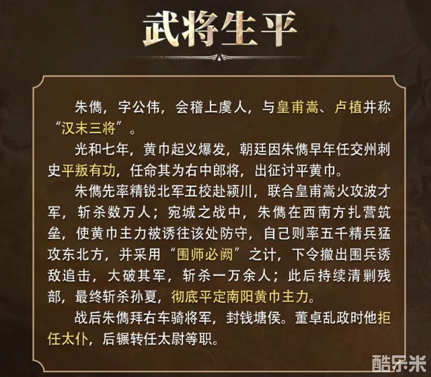 三国谋定天下朱儁怎么样?今天酷乐米小编带来三国谋定天下朱儁介绍。尽管他在三国演义中的名气远不如关羽、张飞等“万人敌”,但他同样是个不容小觑的角色。朱儁的登场不仅让人重新认识了这位三国中的战将,也让很多玩家对他的能力充满了期待。