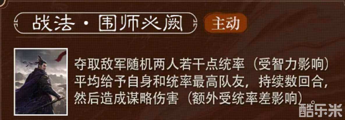 不过在三国谋定天下中,朱儁的定位并非单纯的武力型武将,而是倾向于谋略类的角色。这也意味着,在他的强项中,智慧与战略将会占据重要地位。他的战法“围师必阙”便是这方面的绝佳体现。这个技能看似简单,却蕴含着非常强大的战术优势。具体来说,朱儁能随机夺取敌方两名武将的统率点数,并且这个夺取的数值与朱儁的智力挂钩。拿到这些统率后,他和队伍中统率最高的队友将能共享这部分资源,持续若干回合,并且在战斗结束时,还能造成一定的谋略伤害。简单来说,这个技能能够大幅提升队友的作战能力,同时削弱敌方的统率,给敌军带来非常大的压力。