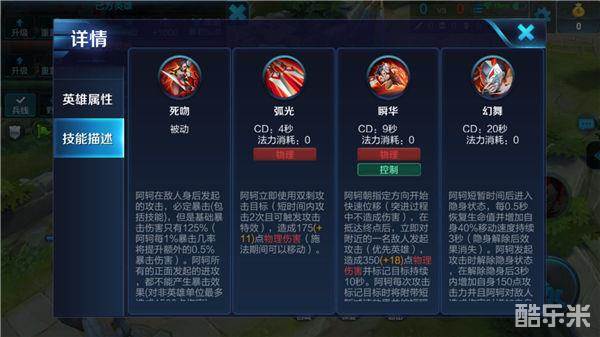 被动技能——死吻:被动技能让阿轲拥有很强的收割能力,在战场中,要通过调整自己的站位,利用背后打出暴击的机制,加快发育、加强收割。