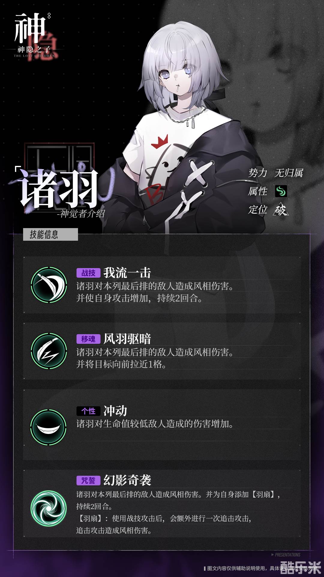 >>> 最初相遇的时候,代理人并没有带给诸羽非常好的印象,毕竟面对自己这般大人物(自称),代理人居然毫无反应,属实令人感到“费解”。但随着羁绊的加深,她逐渐对事务所有了更多的牵挂,也对代理人有了完全不同的看法。大大咧咧的外表下,隐藏着诸羽想和大家一同前进的梦想。
