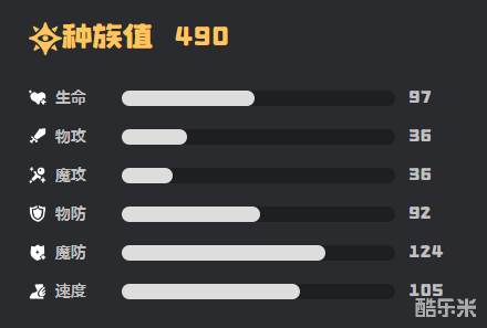 生命97、物攻36、魔攻36、物防92、魔防124,总和490。从种族数值来看,物理性防护还有魔法攻击相对还是比较高的,同时也会拥有较强的防御能力。在面对敌方时自然就可以有效抵御伤害,另外还会拥有很不错的生命数值。伤害可以有效保证生存能力。