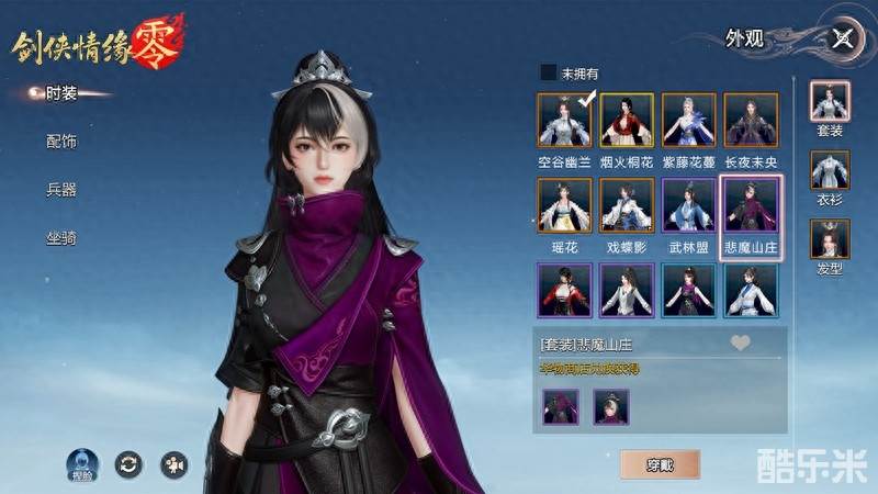 设计上,两款套装均各具特色:「悲魔山庄」套装以玄色为主调,辅以暗紫色披风点缀;胸前衣襟纹有隐若现的紫色火焰暗纹,恰似悲魔弟子心中不灭的江湖热血。发饰则选用了高束马尾搭配发冠,飒爽逼人。而「武林盟」套装则以清爽的蓝白为主色调,乌黑的护臂和肩甲点缀其上。其中腰部更是挂有武林盟的专属挂坠,武林中正派弟子大多都以进入武林盟为荣。