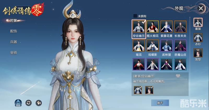 若说阵营专属外观展现的是江湖锋芒,那么外观「空谷幽兰(女)」/「烟茶清昼(男)」则完美诠释了何为“侠骨柔肠”。作为《剑侠情缘·零》经典插画的C位主角,这套时装以“兰生幽谷”和“晨昼清茶”为灵感,将东方古典雅韵与武侠飘逸气质融为一体。
