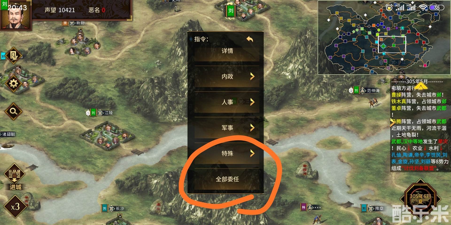 拉到最下面看图片的全部委任。这个设置主要是为了方便管理分城让分城自主发展,需要注意的是这功能必须要这个城市有太守才能打开。然后点完后会变成下图