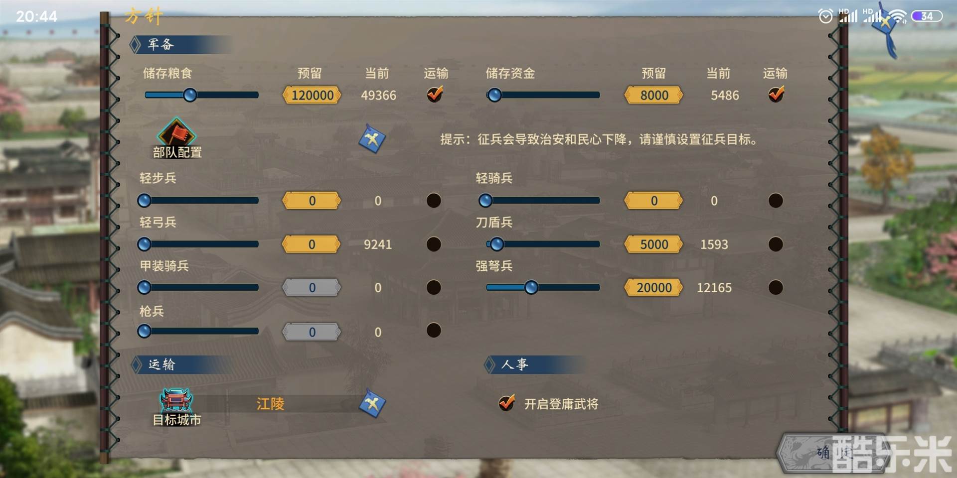 是不是看起来贼复杂?不过能看懂了你会发现这是非常完善的机制。这时候我们看我们的军备看见有 预留和当前这两个设置。其中当前就是指你分城现有的粮食,而左边的蓝色预留表示你要留下来的粮食。说到这里我们得要说一下运输机制
